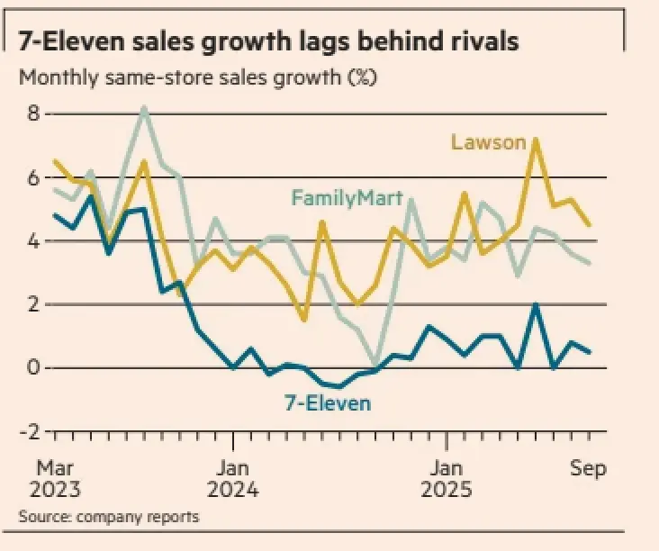 The problems are most acute for Seven & i Holdings, the owner of 7-Eleven, which has fought off a $46bn takeover bid from Canada’s Alimentation Couche-Tard. Monthly sales have grown only 0.8 per cent on average in the current financial year, compared with more than 4 per cent for Lawson and FamilyMart.