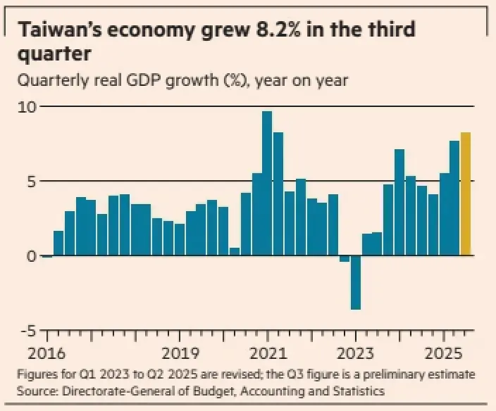Demand for AI and consumer electronics sent Taiwan’s exports soaring 32 per cent year on year in the three months from July to September, pushing GDP growth for the quarter to 8.21 per cent, according to official data released last week.