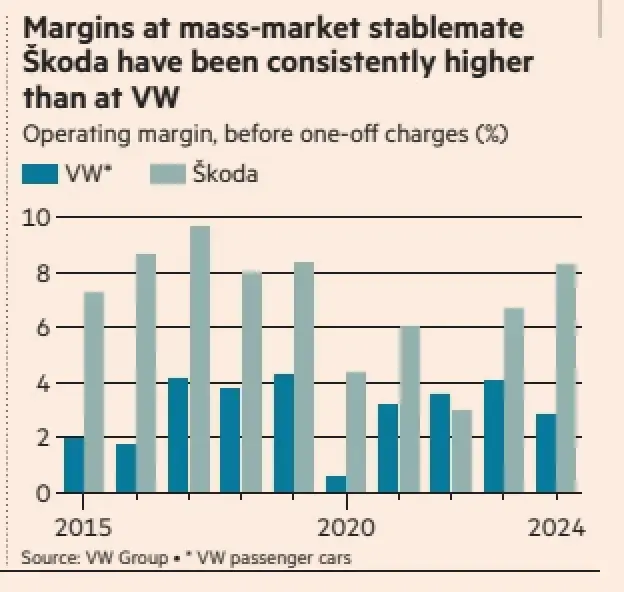But his managerial priorities did not wring the same benefits from the group’s main volume marque. Profitability at the Volkswagen brand was underwhelming even in better times for the wider group. Its operating margin averaged 3.2 per cent across the five years before the coronavirus pandemic, just half of management’s current target and far behind that of Škoda, another of the group’s volume brands whose proanother duction is largely outside Germany.