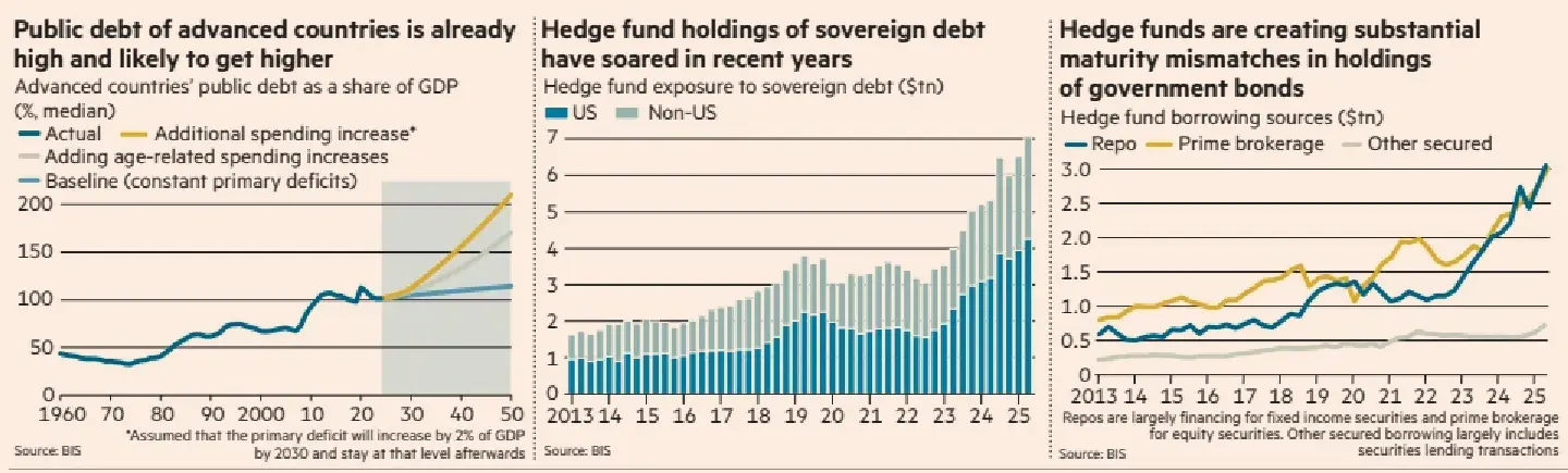 Rising public debt is one concern. Another is how it is being financed. This is part of a bigger change, which is the relative decline of banks and rise of nonbank financial intermediaries within global holdings of financial assets. Thus, the ratio of NBFI holdings of financial assets to global GDP rose 74 percentage points between 2008 and 2023, while that of banks rose by only 17 percentage points. But, warns Hernández de Cos, the combination of rising government bond issuance with the post-financial crisis retrenchment of banks created a steadily growing gap between the supply of government bonds and the assets of bank dealers needed to support the capacity of these crucial markets to intermediate.
